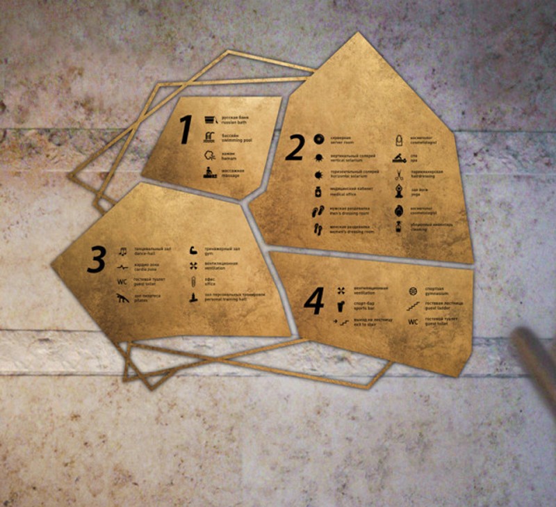 金色是一种材质色,一种略深的黄色,是指表面极光滑(镜面)并呈现金属质感的黄色物体的视觉效果,是高贵、辉煌的象征。在导视系统的设计中,金色的使用会比较有限,高档会所是其聚集地,但在造型的选择中,大多选择华贵的花纹来衬托金色的华丽。下面这套导视在造型的选择上却别出心裁,不规则的图形拼合的导视,充满了古堡与博物馆气息。