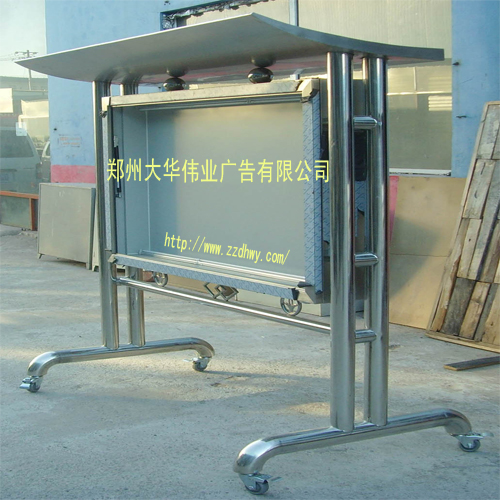 宣传栏的材质多为钢板、不锈钢板、木材或铝型材。钢板和不锈钢板的公告栏会采用钢板烤漆的工艺,表面进行防腐处理。可埋于地面以下,也可用膨胀螺丝固定在硬化地板表面。为了遮挡阳光和雨水,宣传栏一般会有顶棚。宣传栏有前开门和后开门之分,前开门用玻璃锁,后开门用普通锁具就可以,内容多是写真画面或纸张内容。个人认为公告栏采用后开门会更好一些,后开门的公告栏防水防尘比前开门要好。木材的宣传栏多用在园林中,这种宣传栏不太实用,一般只能 张贴户外写真画面。由于木质的宣传栏不能把内容藏于玻璃内部,只能裸露在外面,所以内容得不到保护。