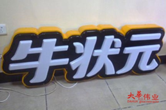 铁皮烤漆包边吸塑发光字: led模组作为灯源,经过吸塑成型的亚克力面罩作为面板,底板和四周围边都采用经过焊接、打磨、烤漆的铁板。(透光性好,制作较为复杂,周期长,牢固性好,适合做大字和工程) 底板及四周围边材料可选择铁皮、镀锌板、铝板、不锈钢板;面板可选用亚克力板;材料的选择、led的排列密度、安装的难度等因素都会影响发光字的整体报价